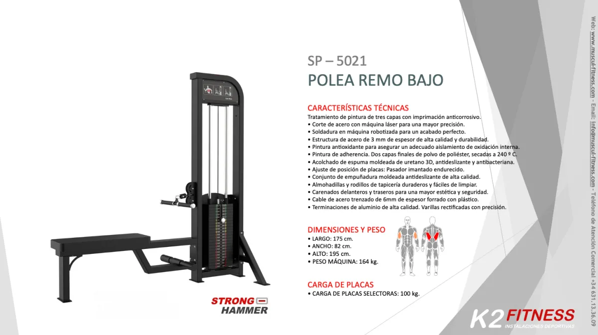 Polea Remo Bajo. Esta máquina nos permite hacer una gran cantidad de variantes. Tan solo debemos cambiar el tipo de accesorio para la polea o la posición de las manos; sea jalón al pecho, supino, agarre abierto o cerrado, jalón a una mano… La variedad de agarres nos permitirá trabajar muchas fibras distintas desde distintos ángulos, en concreto dorsal y bíceps. Los jalones dan prioridad a la amplitud dorsal. Asociados: Multiestación 5 Puestos – Maquina Crossover – Polea Alta / Polea Baja.